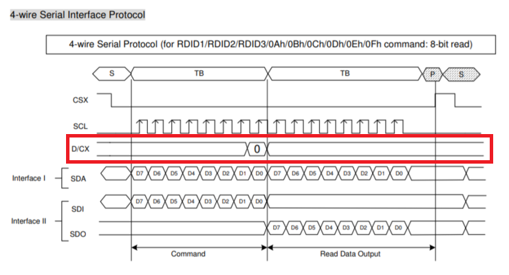 ILI 문서를 참고하던 중 이해할 수 없는 신호 라인이 있었다. SPI에서 command와 data를 선택하는 핀인데, 저 데이터시트 내용은 SPI 동작 방식을 나타내는 핀이고 D/CX는 사용자가 적절한 상황에서 0, 1을 모두 사용할 수 있기 때문에 저렇게 표시한 것이다