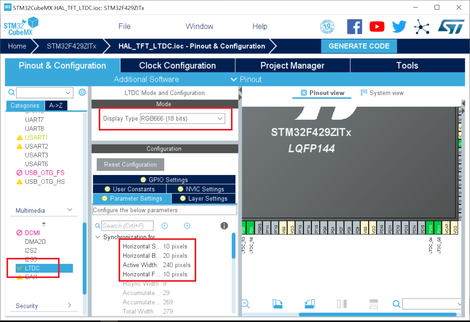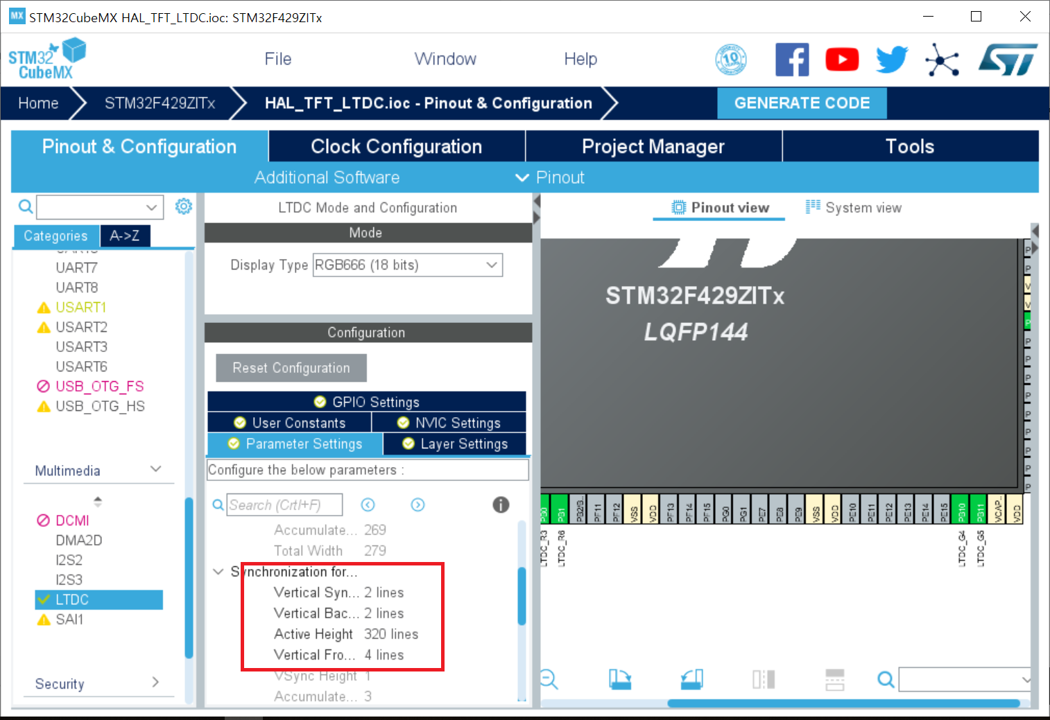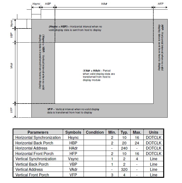 다음은 LTDC 설정을 하는데, 먼저 TFT쪽을 보면 다음과 같이 주어진 SYNC에 맞춰서 동작시킬 수 있다