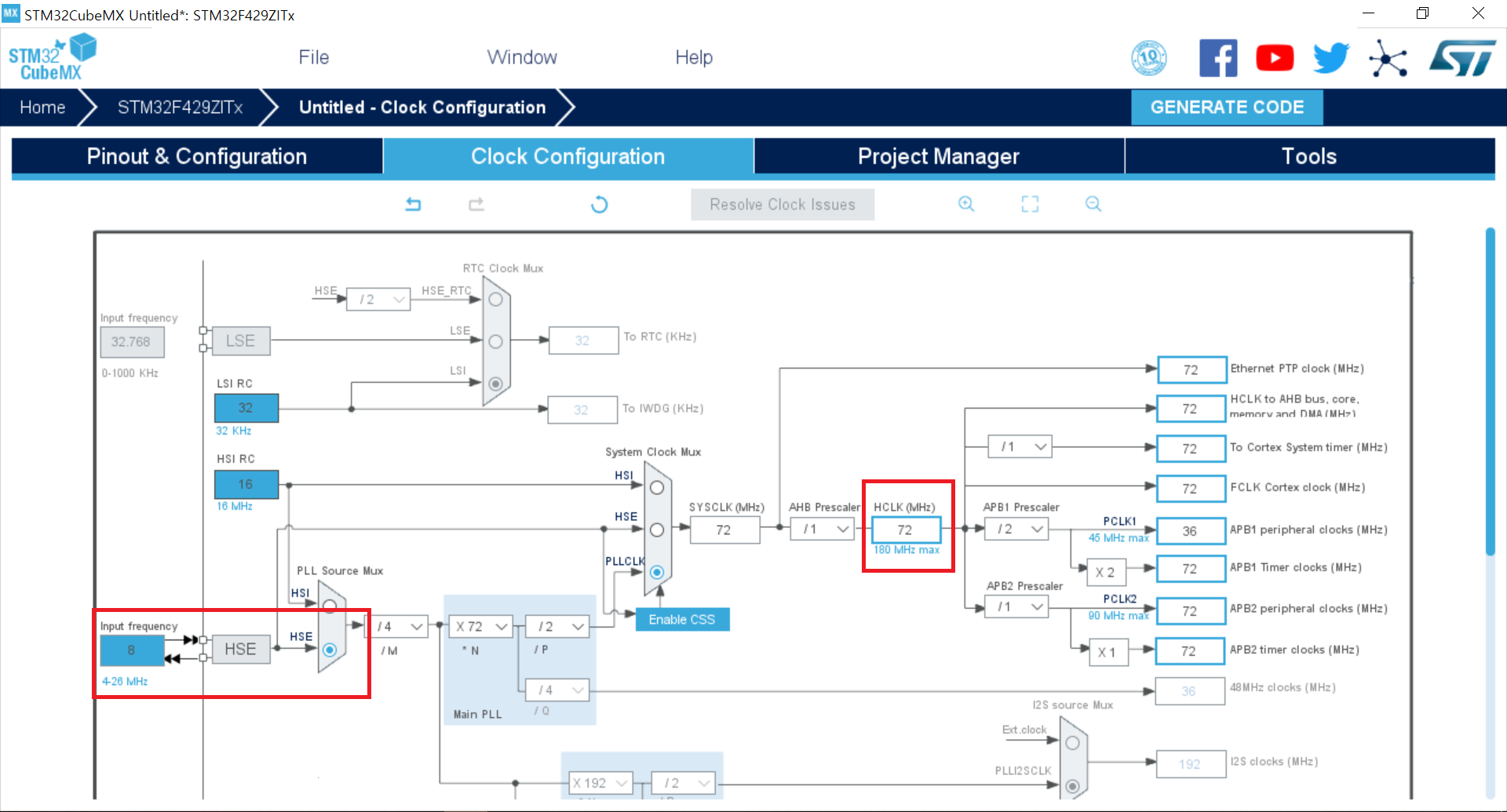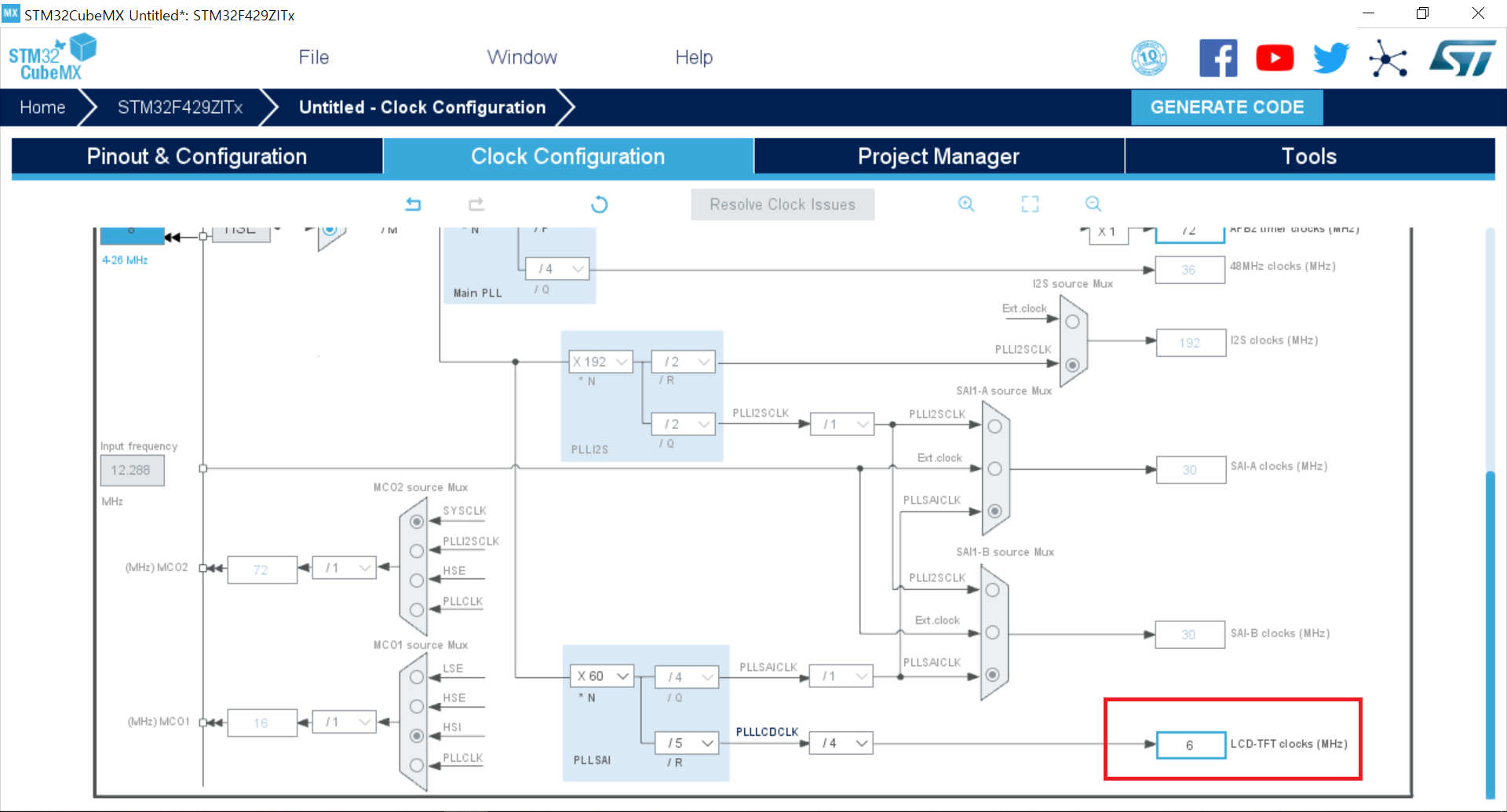 SPI5번과 TFT가 연결되었음을 알 수 있다. 연결 전에 Clock 설정을 다음과 같이 해주어야만 한다