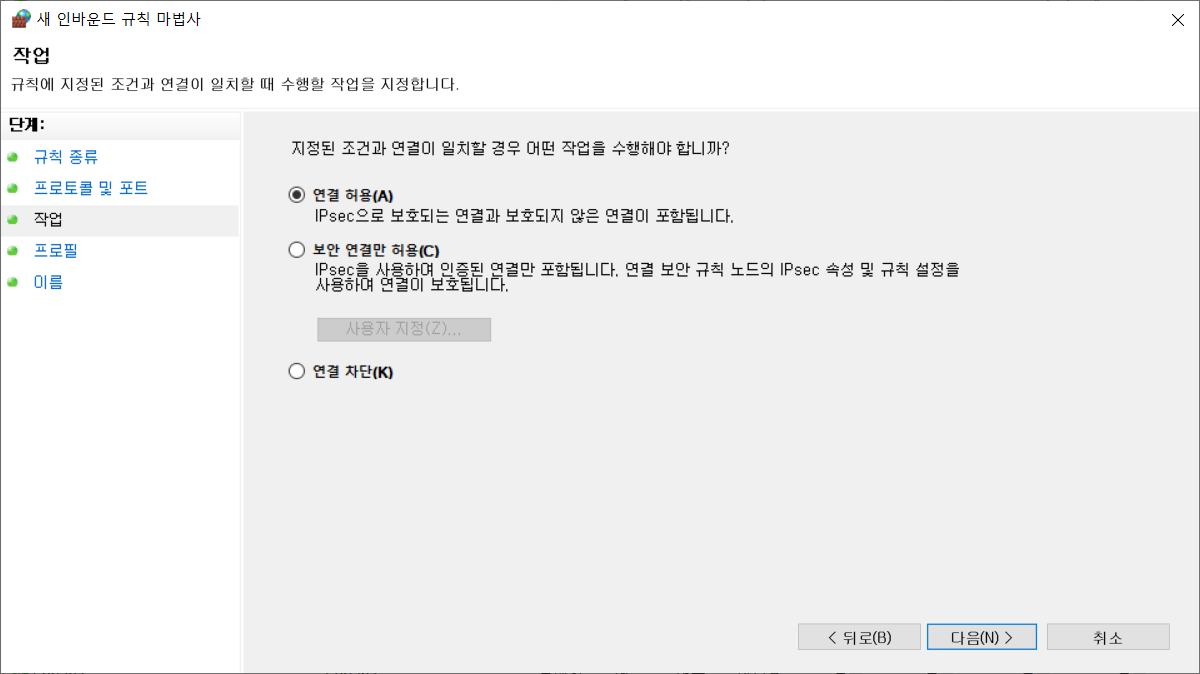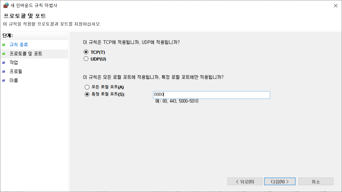 4. 그리고 마지막으로 방화벽에 외부 포트에 대해선 접근을 허용하도록 설정을 한다. 윈도우에서 Window Defender 방화벽을 열도록 한다