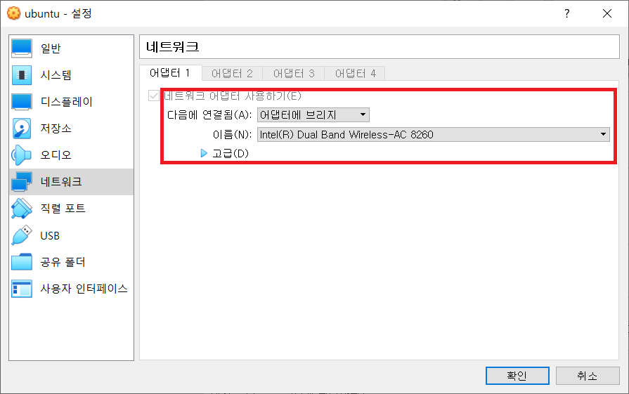 1. 먼저 VM VirtualBox에서 네트워크를 NAT가 아닌 무선 네트워크 어댑터에서 바로 받아오도록 설정한다. NAT은 Host PC에서 IP를 할당받고, 어댑터에 브리지는 공유기에서 직접 IP를 할당받게 된다