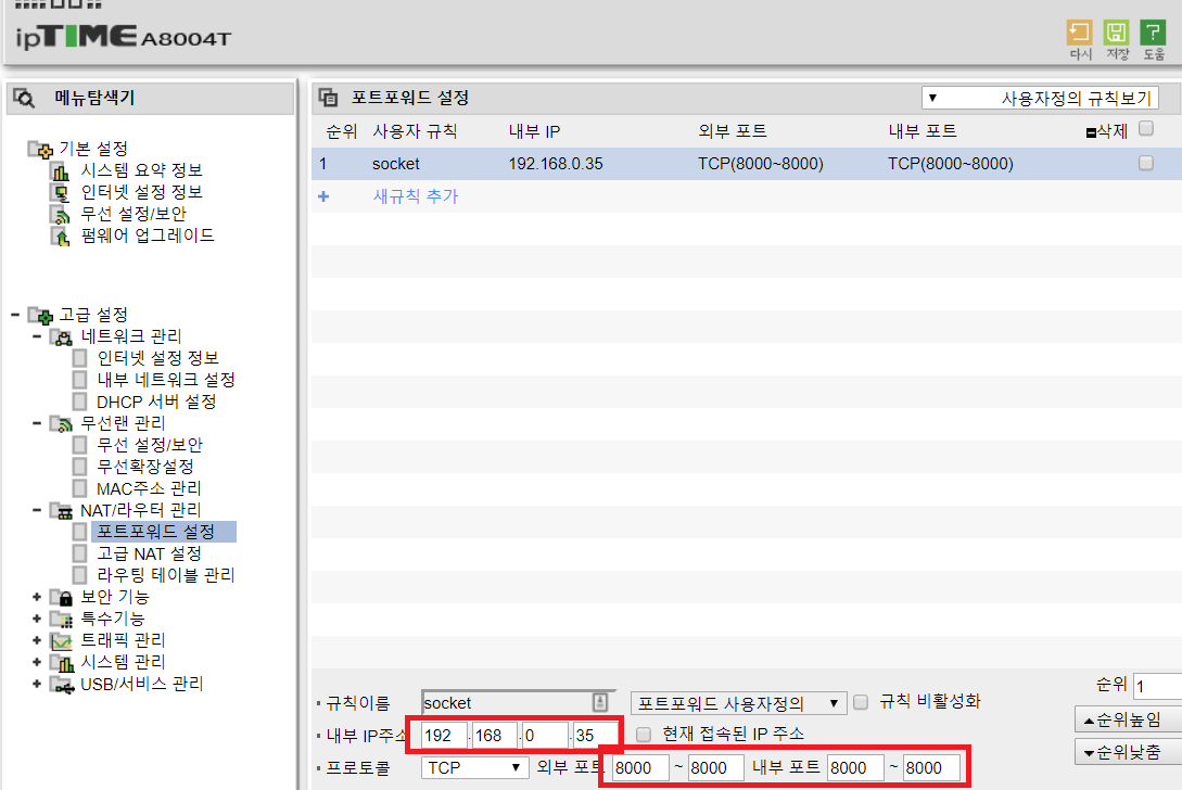 3. 그리고 ipTIME에 접속해서 포트포워딩 설정을 하도록 한다