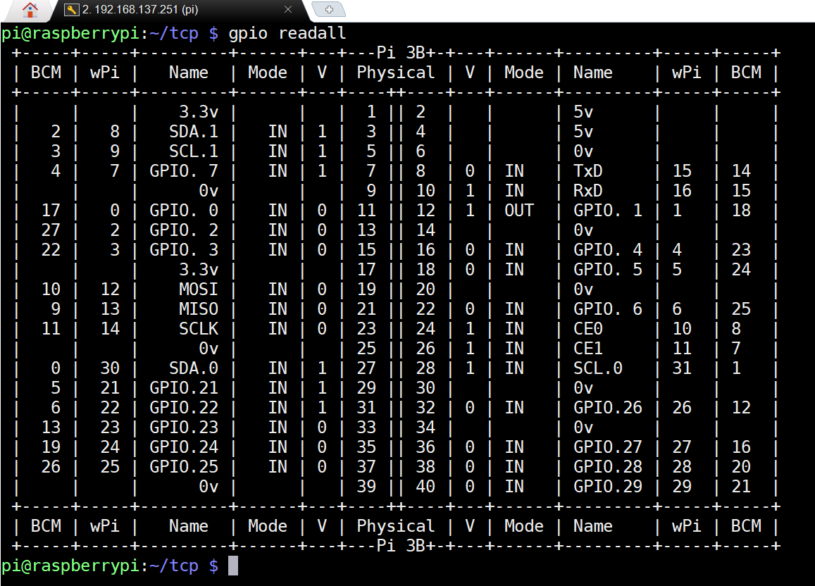 설치가 잘 완료되었다면 터미널에서 wiringPi 맵을 볼 수 있다
