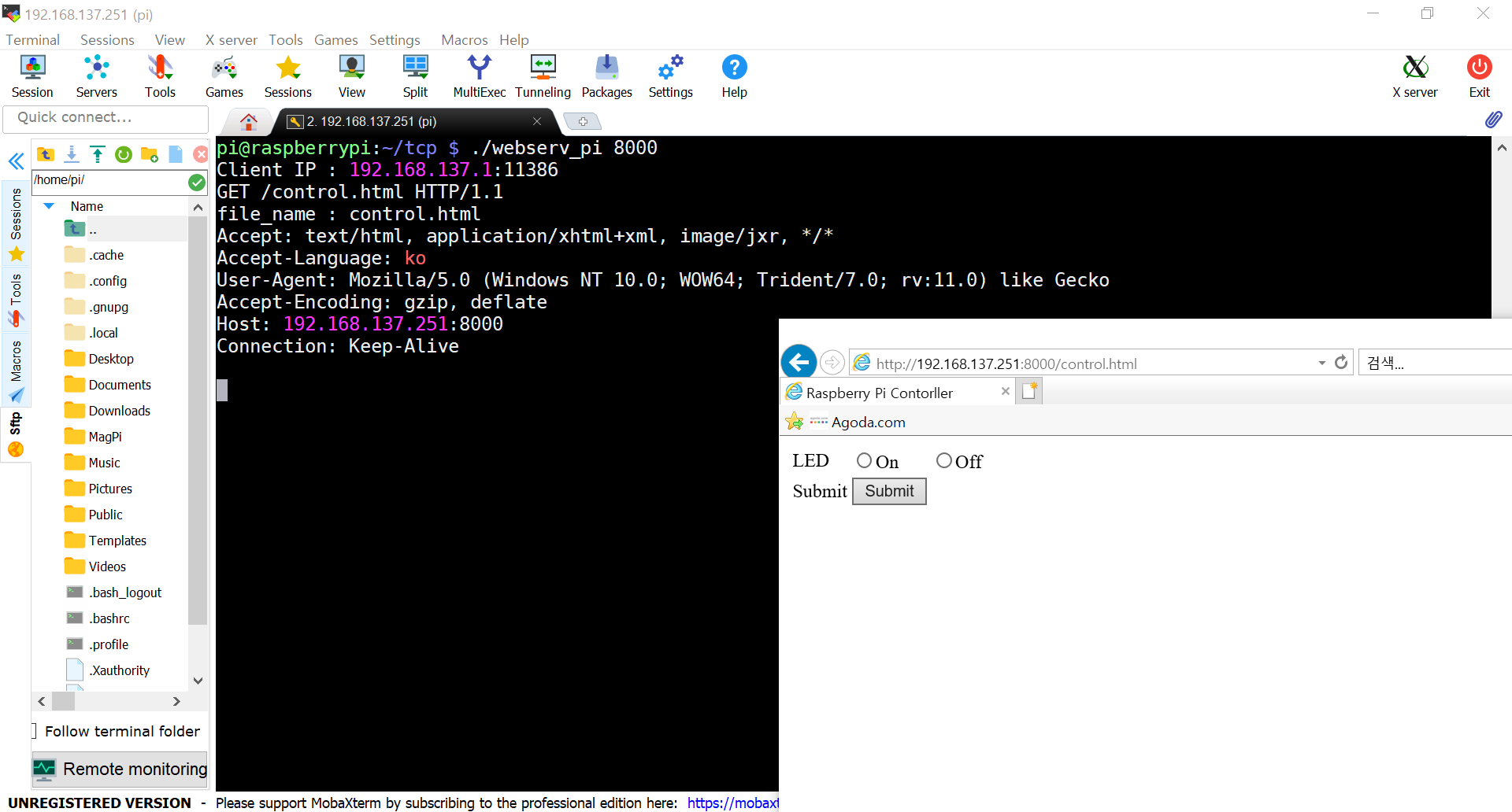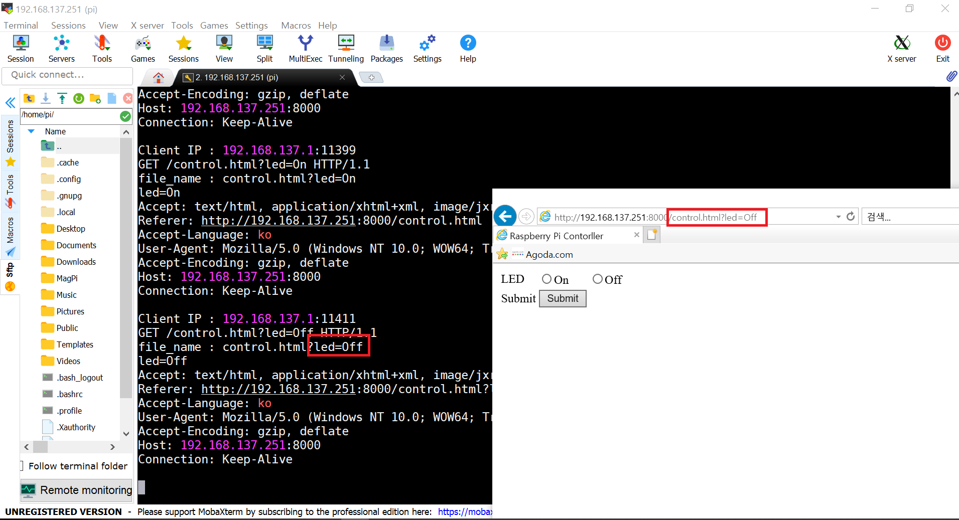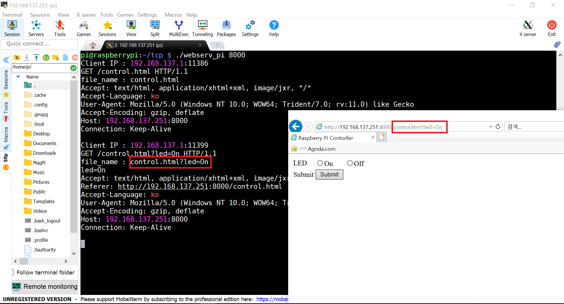 기존에 만든 웹 서버를 기반으로 LED on/off HTML 코드를 분석하는 부분을 추가했다. 기본적으로 해당 코드를 실행하기 위해서는 wiringPi가 설치되어야 한다