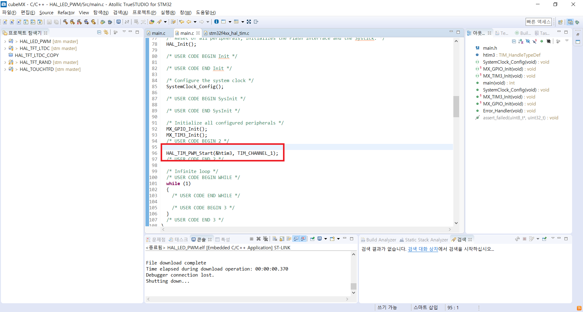 그리고 코드를 생성하도록 한다. 초기에 정한 CCR 값으로만 제어하고 싶다면 코드 작성은 매우 간단하게 된다. 아래 코드로 HAL_TIM_PWM_Start로 시작하면 된다