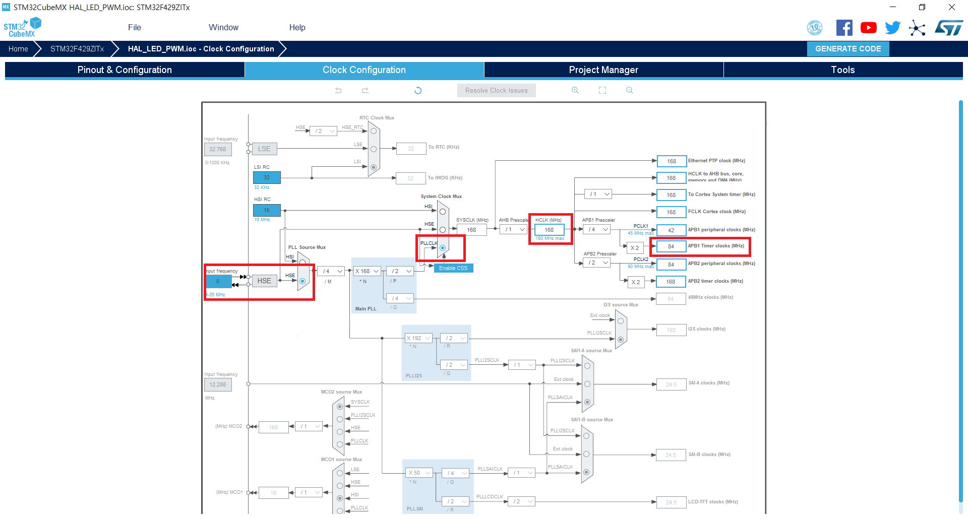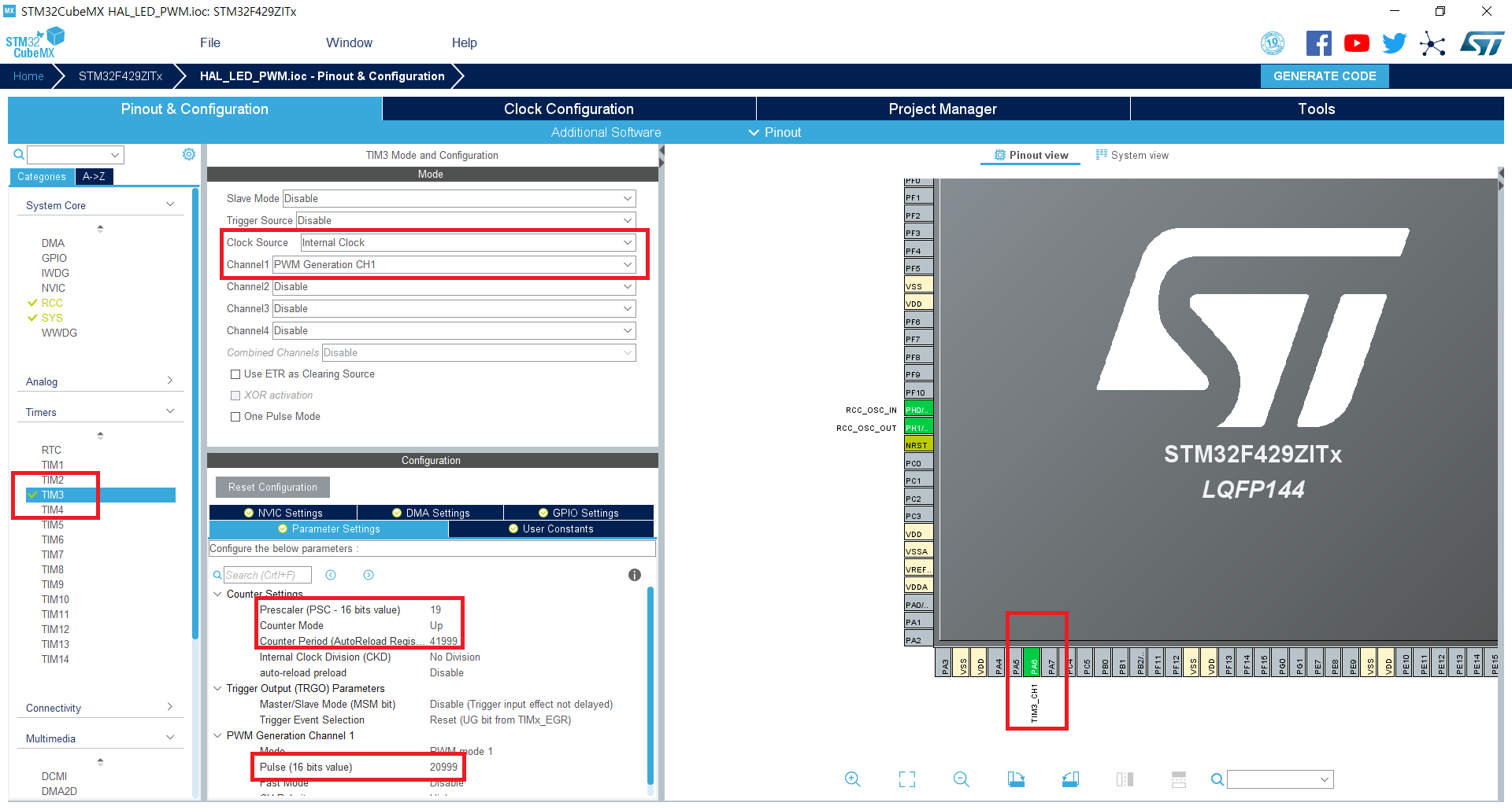 지금 APB1의 클럭이 84MHz다. 따라서 1/84M * 42000 * 20 = 0.01로 100Hz 펄스를 만들 준비가 됐다. 그리고 듀티는 CCR 레지스터로 제어하게 되는데 아래 Pulse란에 써주면 되는데 ARR 레지스터가 42000이니 그에 대한 반을 기입하면 된다