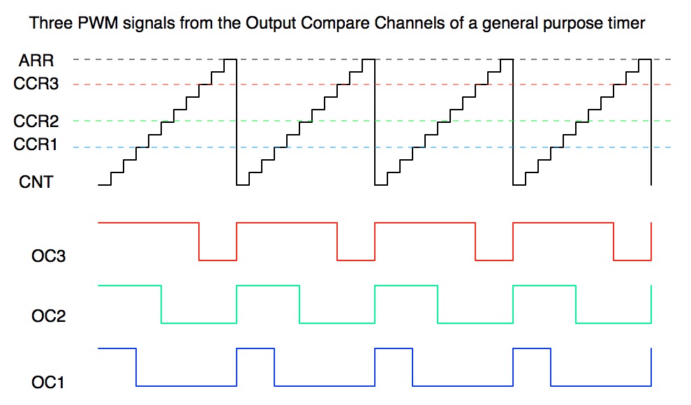위 그림과 같이 PWM 주기는 ARR 레지스터와 PWM으로 맞추고, 추가적인 CCR 레지스터로 PWM 듀티비를 맞출 수 있다. CCR 레지스터 전의 HIGH, CCR 값부터 ARR까지가 LOW가 일반적인 PWM 신호가 된다. 설정을 통해 HIGH, LOW를 충분히 바꿀 수 있다
