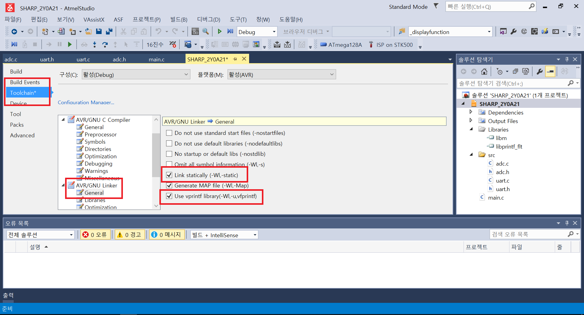 3. 마지막으로 프로젝트에서 Alt+F7으로 들어가서, Linker 부분에서 Linker statically와 use vprint library 부분을 사용한다고 체크한다
