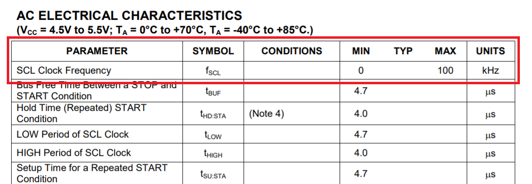 코드를 차근차근 작성해보려고 한다. 먼저 TWBR 레지스터 설정하기 위해서 DS1307의 Clock Frequency를 살펴봐야 한다. 데이터시트를 확인하면 최대 100KHz까지 속도를 지원한다