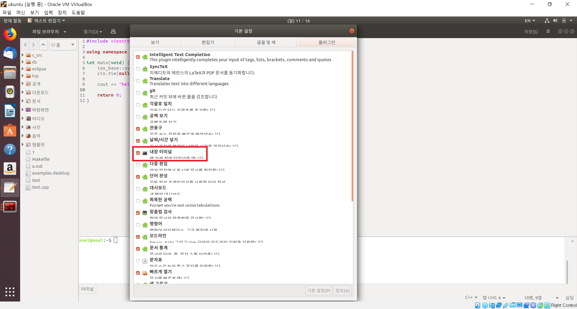 설치가 완료되면 다양한 플러그인 설치되었음을 알 수 있다. 그리고 사용자가 사용하려는 플러그인만 클릭한다. 필자의 경우에는 내장 터미널 부분과 파일 브라우저를 활성화시킬 것이다