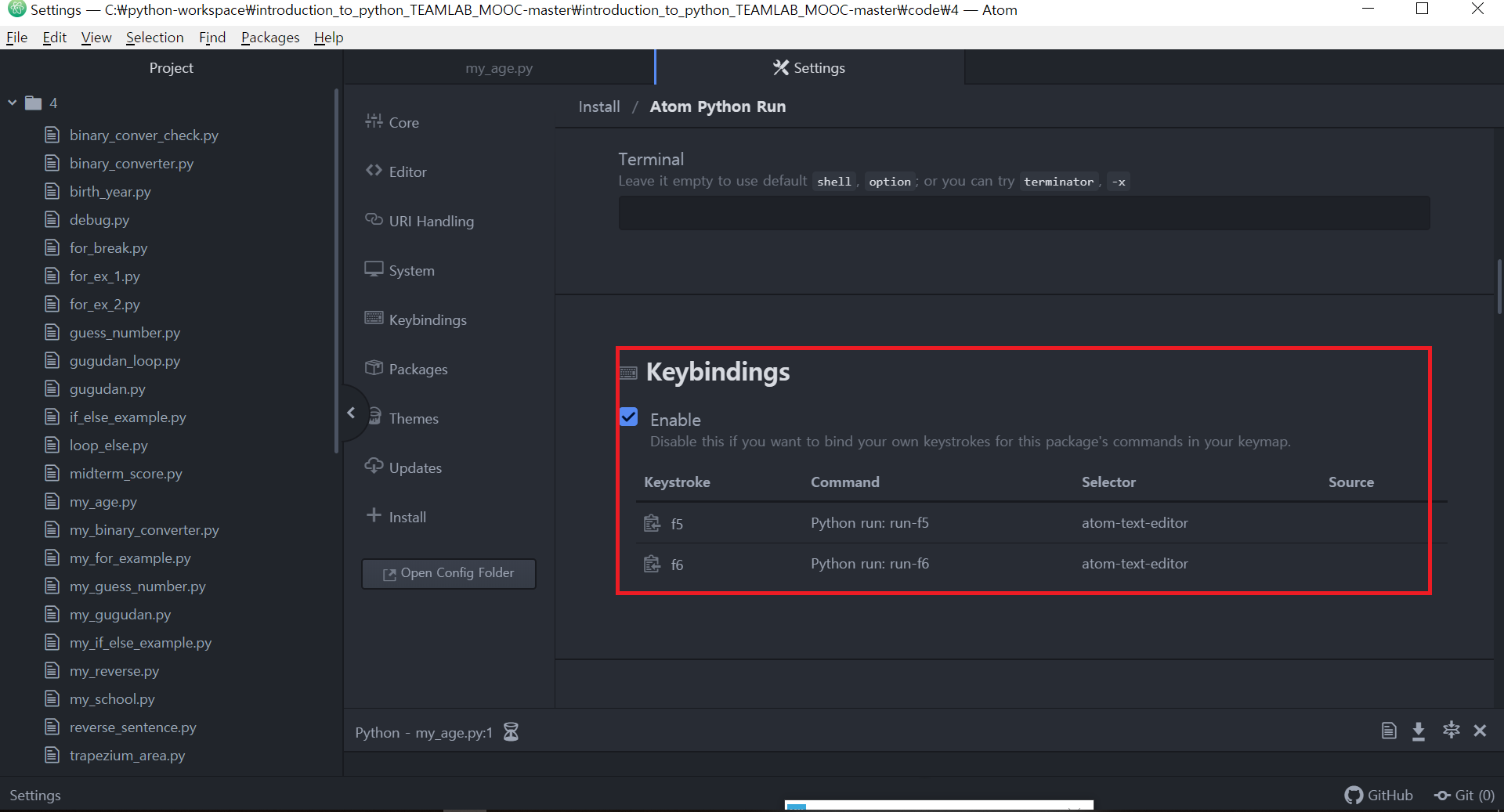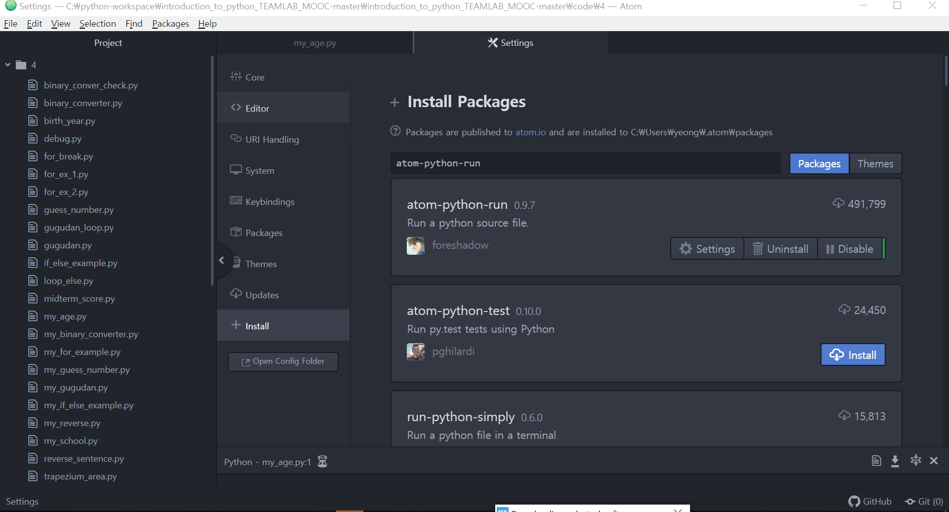 이전 포스팅인 https://noel-embedded.tistory.com/848 (Atom에서 파이썬 인터프리터 실행하기)의 치명적인 단점은 출력에는 문제가 없지만 input 입력을 받지 못한다는 점이었다. 따라서 다른 패키지를 찾아봤는데, 바로 터미널로 연결해주는 패키지인 atom-python-run을 찾을 수 있었다