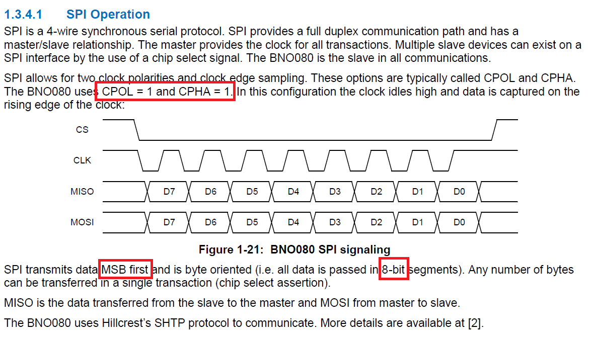MCU가 BNO080에 접근하려면 PS0/wake 핀을 Low로 떨어뜨려야 한다. 그리고 BNO080은 데이터를 전달할 준비가 되었다면 H_INTN 핀이 Active Low로 바뀌게 된다. 이후에 SPI 통신으로 데이터를 파싱하는 구조다