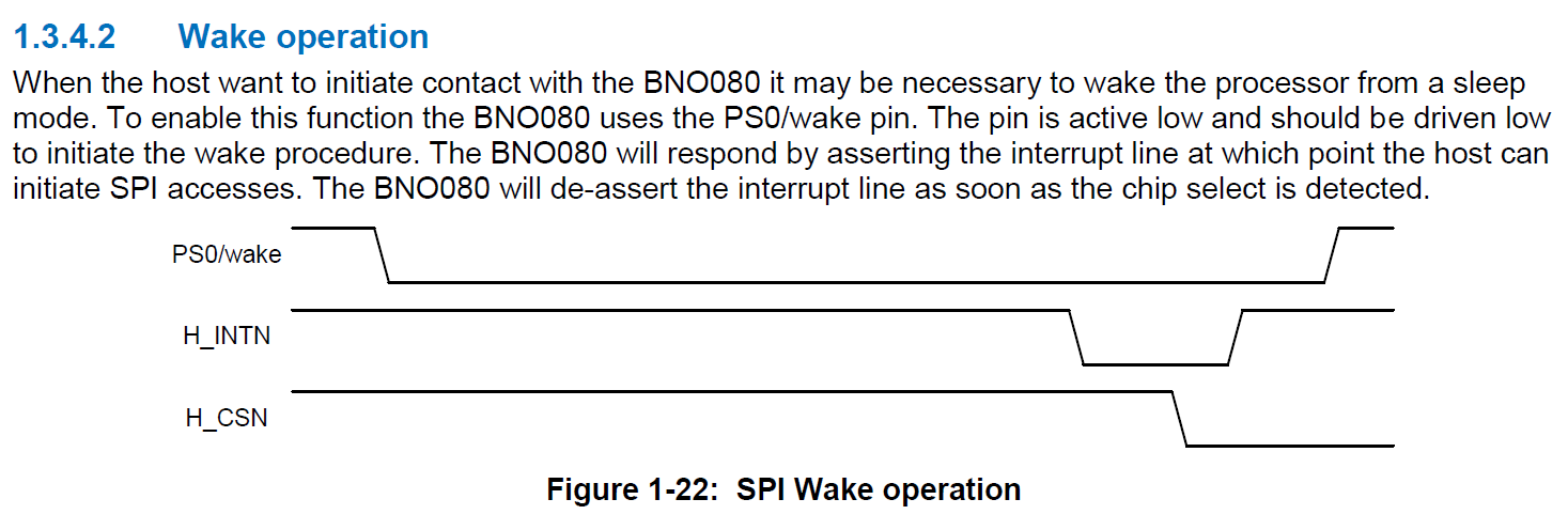 MCU가 BNO080에 접근하려면 PS0/wake 핀을 Low로 떨어뜨려야 한다. 그리고 BNO080은 데이터를 전달할 준비가 되었다면 H_INTN 핀이 Active Low로 바뀌게 된다. 이후에 SPI 통신으로 데이터를 파싱하는 구조다