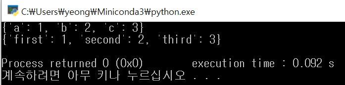 가변 키워드인자 **는 c++의 map과 유사하다, 키워드와 값을 같이 할당해준다