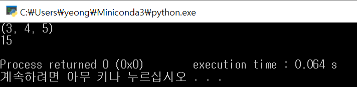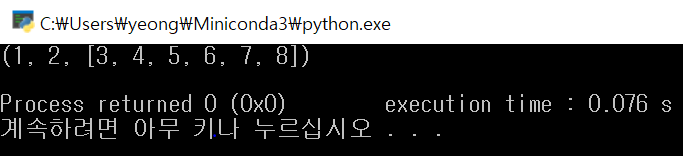 - 가변인자로 입력된 값은 tuple type으로 사용된다 (참고로 tuple은 () 안에 데이터를 담는다)
