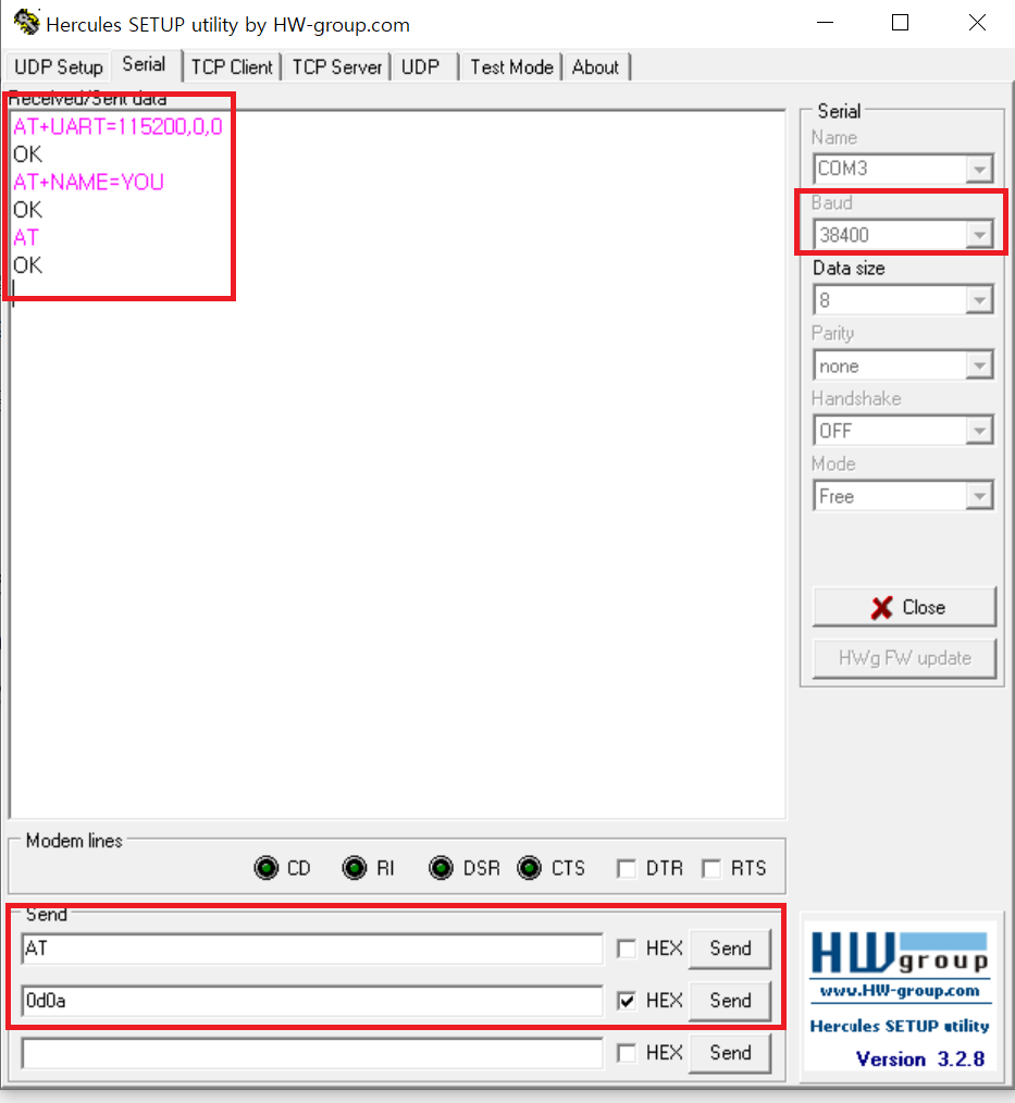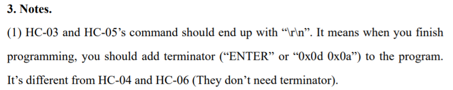 HC-03과 HC-05 기반의 명령어는 반드시 \r\n으로 종료되어야만 한다. 따라서 명령어 맨 마지막에 반드시 0d0a 16진수 수 값을 전달해야만 한다
