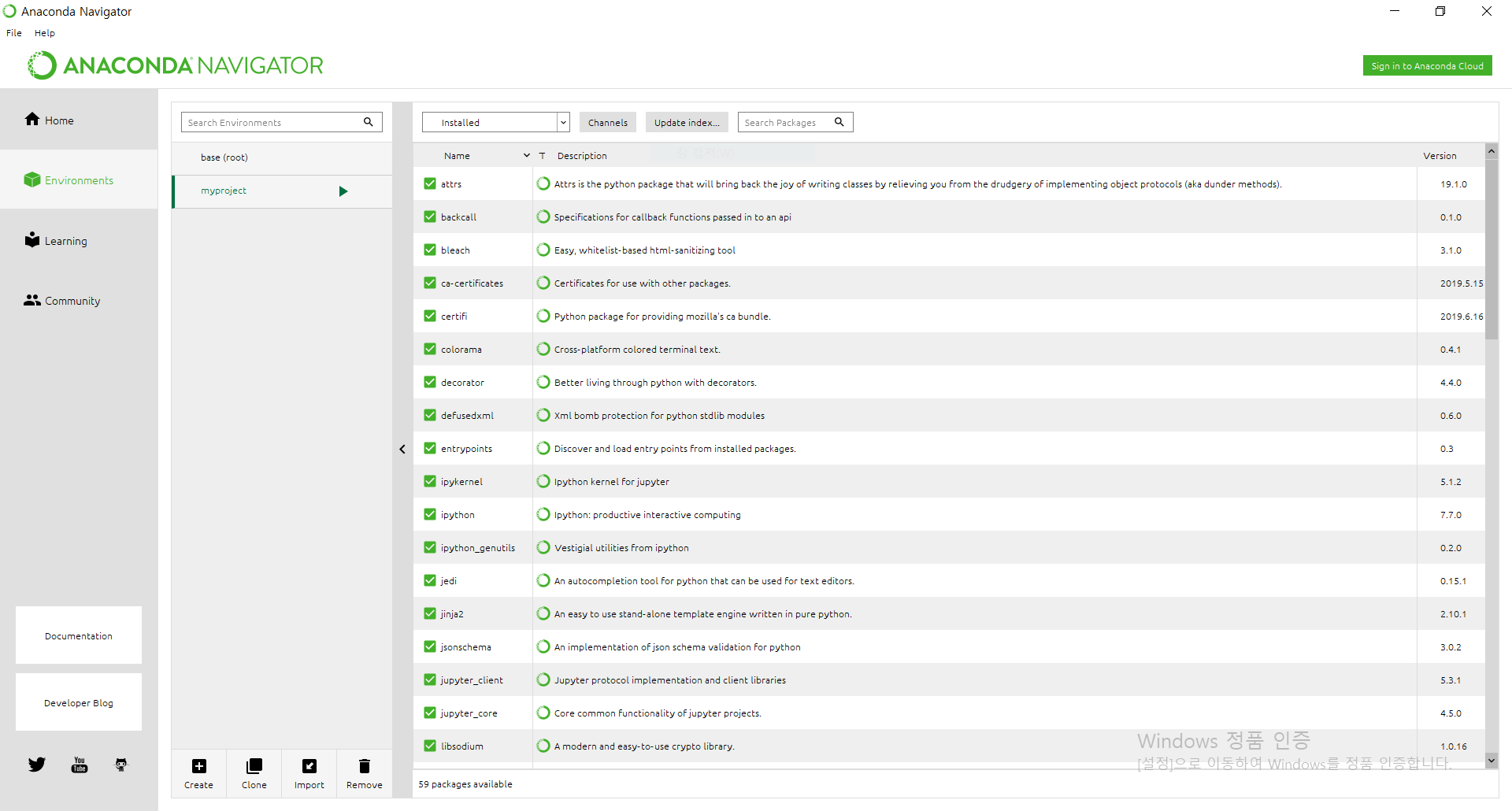 아나콘다를 설치한 이후, anaconda navigator를 실행해서 GUI로 쉽게 가상환경을 만들고 구성할 수 있다