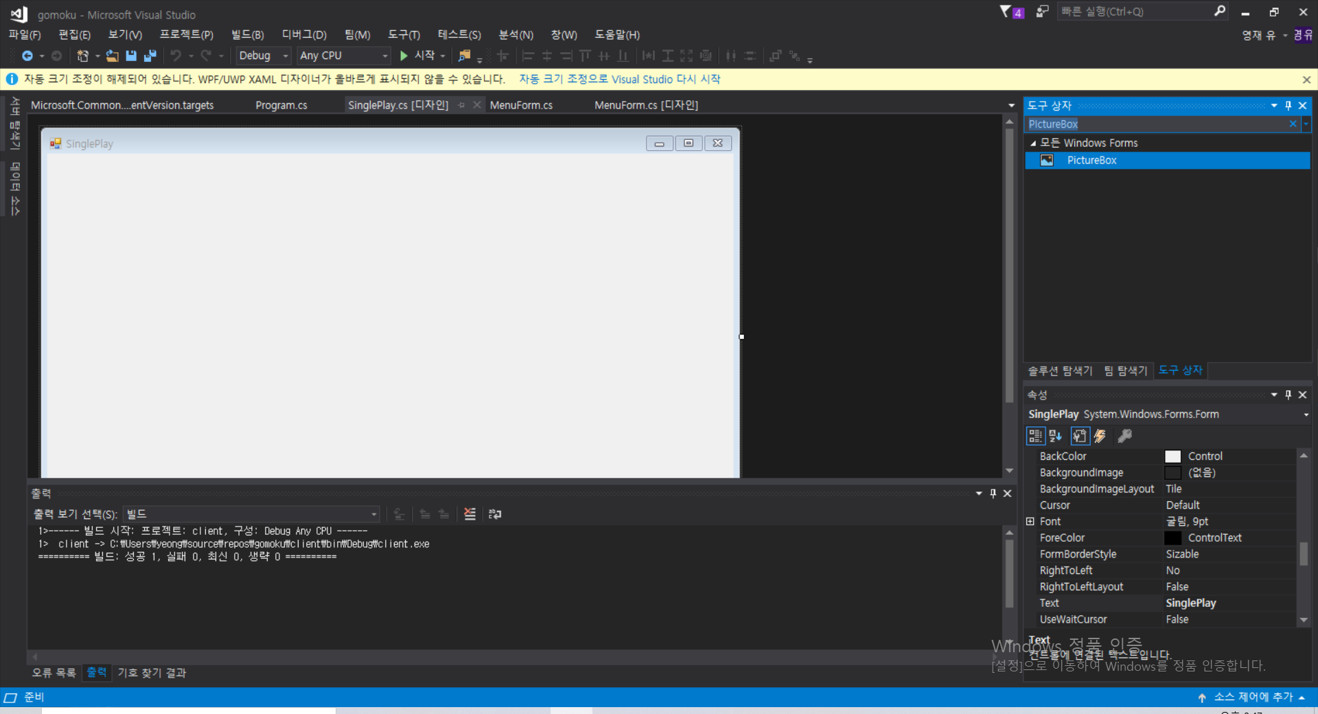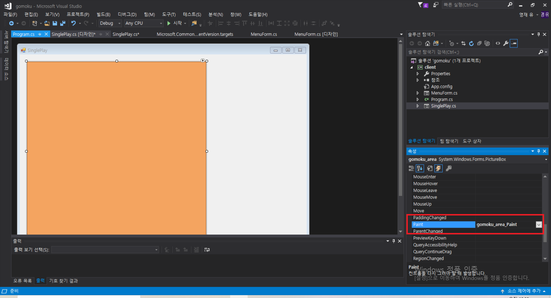 그리고 마찬가지로 SinglePlay 화면이 처음으로 켜졌을 때 화면을 구성하는 이벤트인 Paint 이벤트까지 넣을 것이다