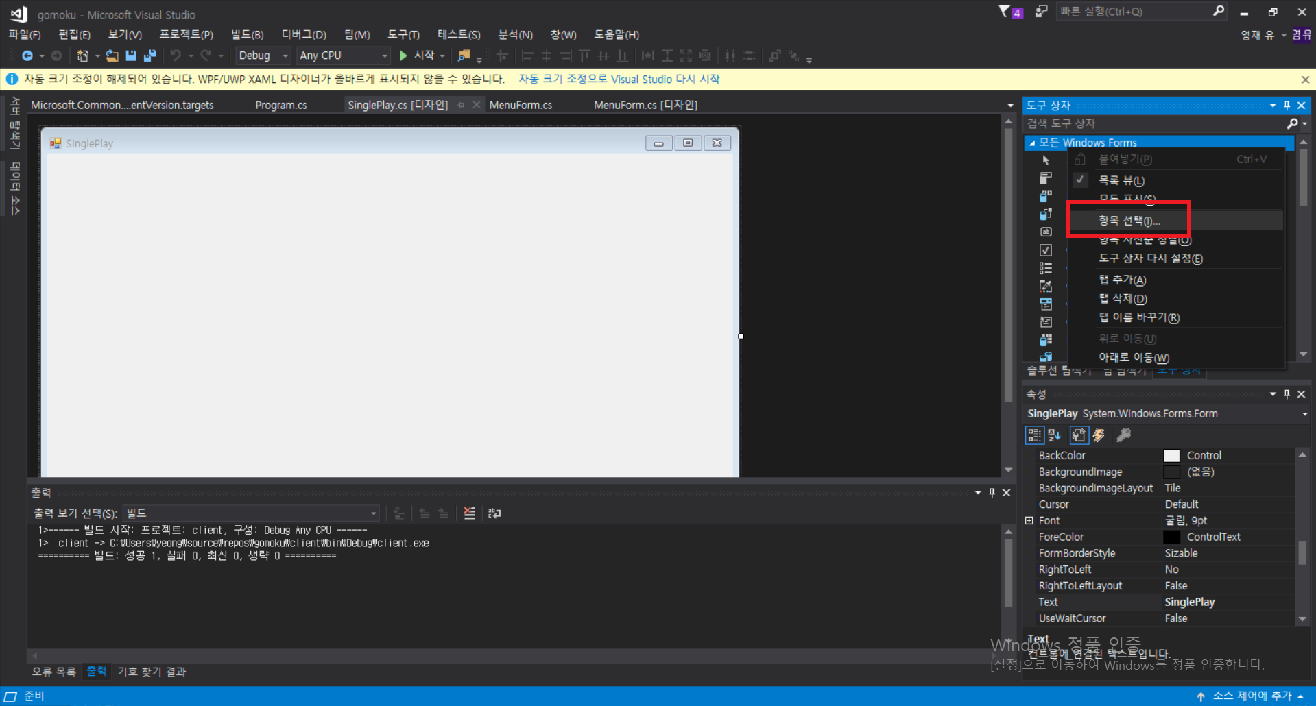 오목 게임 화면을 구성하려고 한다. 그림을 넣기 위해서 PictureBox를 삽입해야만 한다. 혹시나 PictureBox가 검색되지 않는다면 다음과 같은 절차를 밟는다