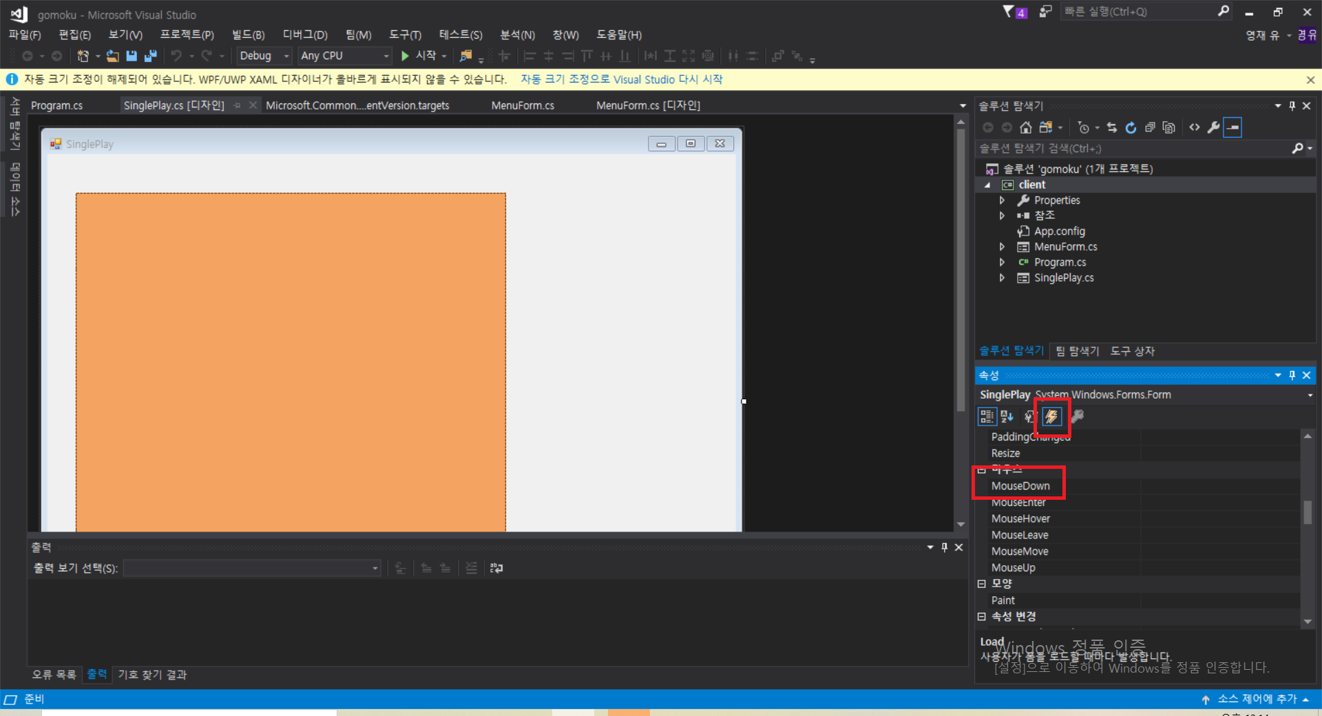 다음과 같이 적절한 사이즈와 색상을 주어서 만들 수 있다. 그리고 도구상자에서 번개모양을 클릭하면 이벤트 처리를 할 수 있는 목록이 나열된다. 먼저 오목판에 오목이 놓아졌을 때의 처리를 하기 위해서 MouseDown 이벤트를 처리할 것이다