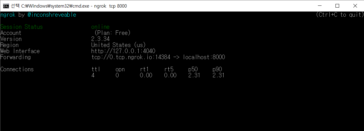 정상적으로 완료가 되었다면, ngrok tcp [원하는 포트번호]를 입력하면 다음과 같은 창이 뜰 것이다