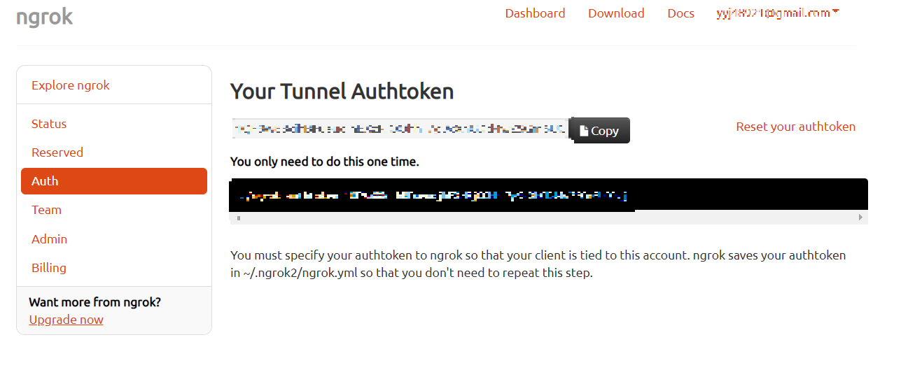 다음은 서버 프로그램에 공인 IP를 부여하고 싶다면 인증 토큰을 확인해야 한다. ngrok 사이트에 접속을 해서 회원가입을 마쳤다면 인증 토큰을 확인할 수 있다