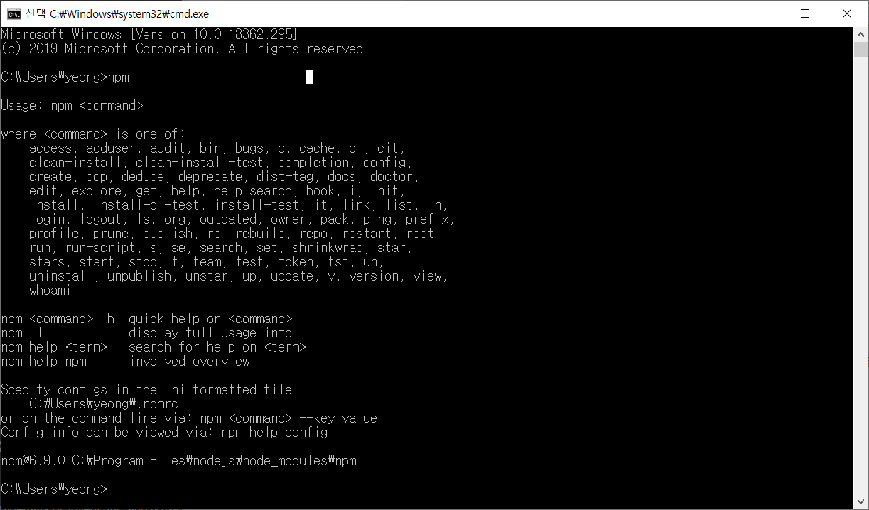 설치가 잘 되었다면, npm 명령이 올바르게 아래와 같이 출력될 것이다
