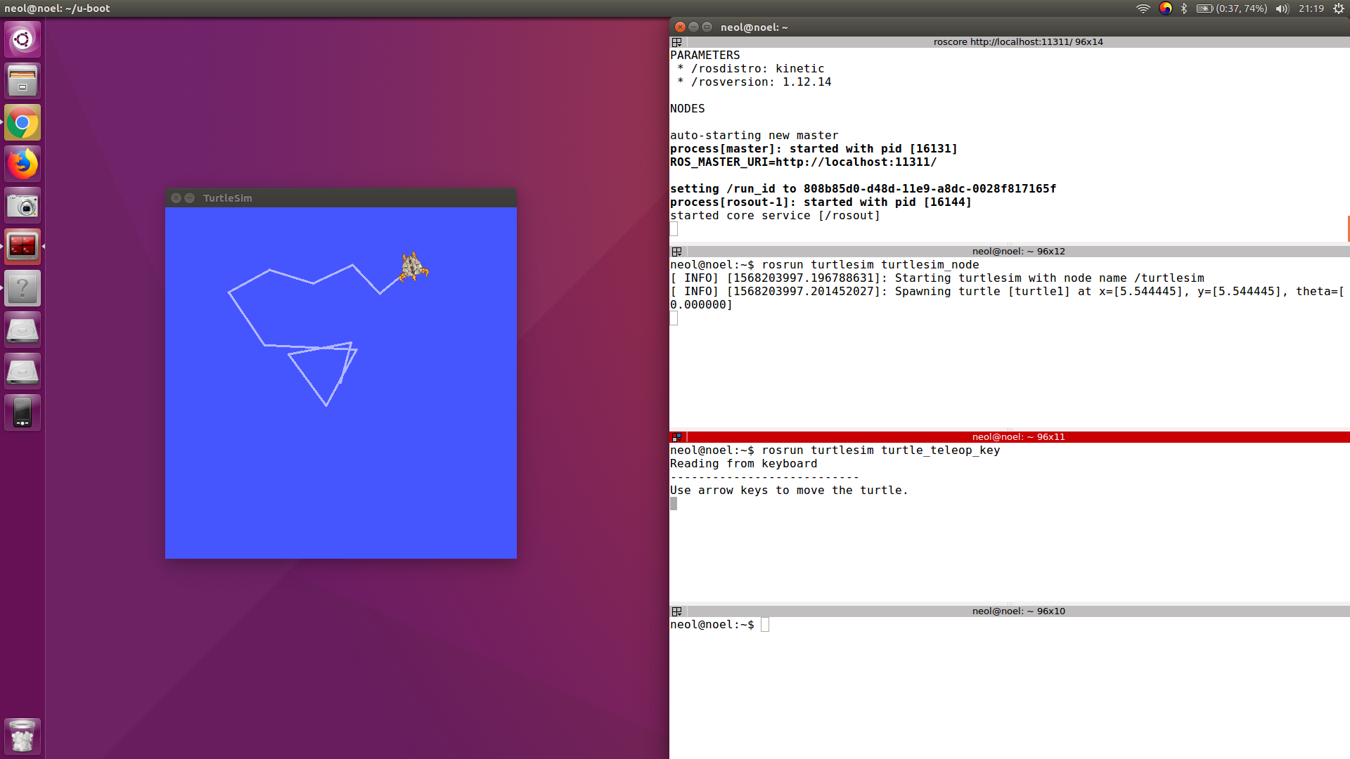 그러면 turtlesim_node 실행파일이 실행될 때는 거북이가 있는 그래픽 창이 생겨날 것이다. 그리고 아래 터미널 창에서 마우스를 올려놓고, 방향키를 움직이면 거북이가 움직이는 것을 확인할 수 있다