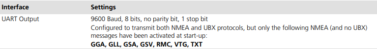 출력되는 UART 정보는 다음과 같다. 중요한 점은 NMEA와 UBX 프로토콜을 지원하는 NMEA로 출력을 하기 때문에 UBX로 보고싶다면 따로 변환을 해야만 한다. 그리고 다음 NMEA는 GGA, GLL, GSA, GSV, RMC, VTG, TXT의 글자로 메세지를 출력한다